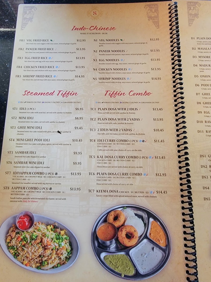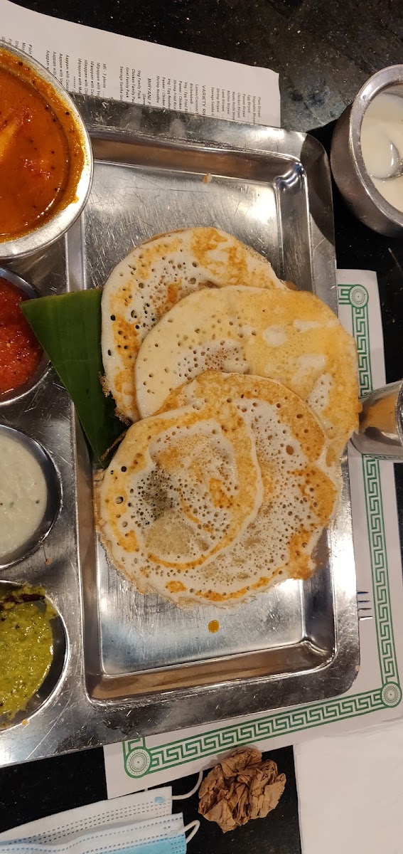 Let me start off by say it was 16,000 reviews. It's going to be 16,001 now because this place is awesome. I haven't had a chance to have much Indian food lately, so I've been eating at a lot of places like curry, kitchen Star of India but Indian breakfast is something different. Start off by the establishment is huge and beautiful with well decorated design and the layout with the bar in the middle of the large sections makes it ideal to keep a flow consistent between the parties having fun. Starting off after sitting down we saw the most adorable robot. This thing was weekend and smiling handling food like a champ. The menu after taking a look and hearing the suggestions from the staff, I decided to go with the combination breakfast. The Mrs. Got the pori ghee dosa. Oh and then we added this onion dosa as well. It was really really something I just I had before and I just really liked it. Had another place. Boy I'm glad I got it So long story short, I didn't even pick up my utensils. I grabbed my hands and I dug in. Everything was delicious. Oh yeah and everything's vegetarian so don't forget that. But it didn't matter. It's just place rocks. Each chutney was good for their own types of dipping. My favorite breakfast item on the combo plate was definitely the saffron sweetened. What would be constitutely grits? Overall 16,000 other people agree in some way shaper form that this place is good and you should definitely stop by and check it out for yourself